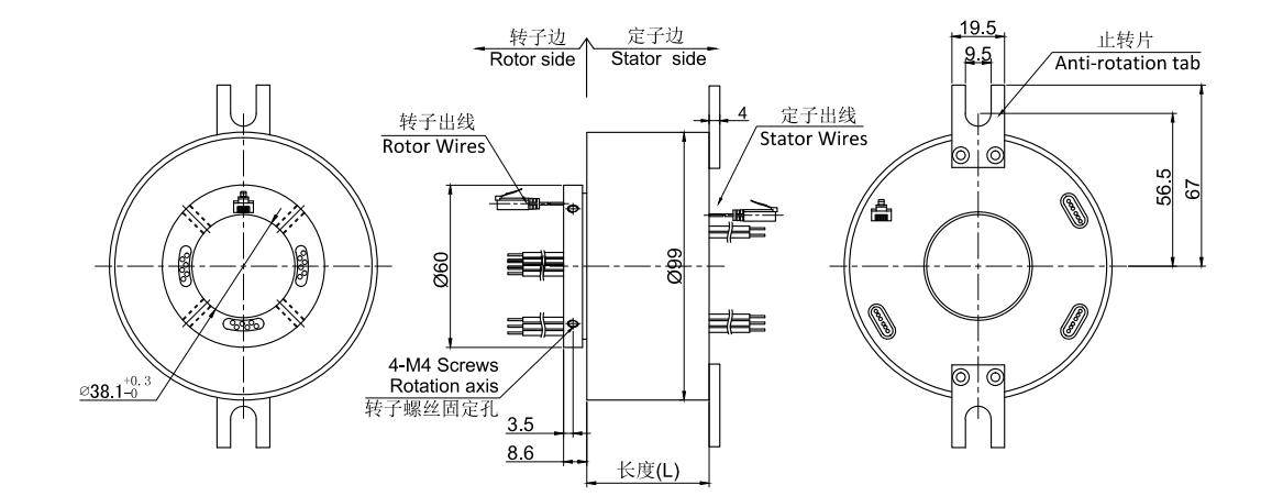 • · ME2381系列以1路1000M以太网滑环,网线导电滑环,内孔38.1mm,外径为标准99mm的紧凑型整体式结构的1通道100M/1000M 以太网整体式精密导电滑环。