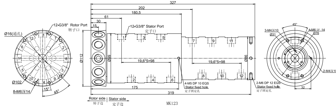 MK123(纯气动旋转接头) 尺寸图 12进12出G3/8"牙