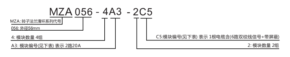 *比如MZA056-4A3-2C5, 其中4A3-2C5是指:4组2路20A(即8路20A)+2组1根电缆含(6路双绞线信号+带屏蔽)